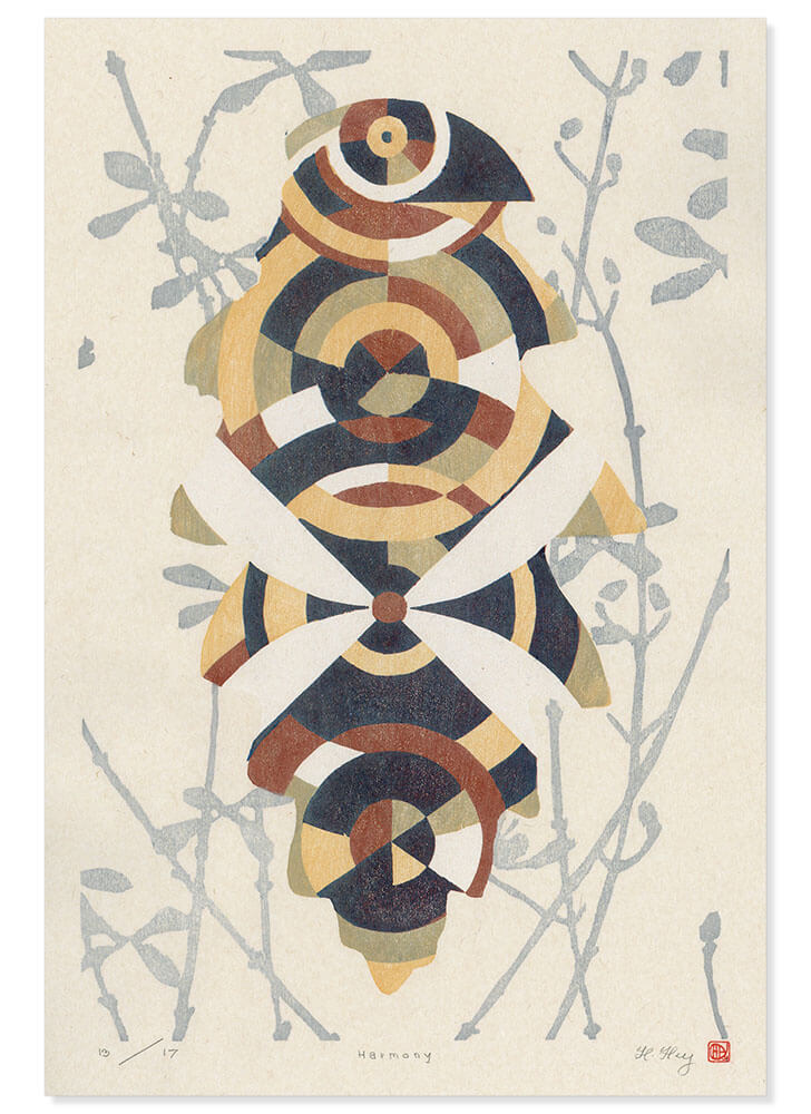 Unieke houtblokprints (Mokuhanga; Japanse techniek voor houtblok printen) (gemengde techniek). Mokuhanga is het Japanse woord voor drukken waarbij met de houtblokdruktechniek met waterverf gebruikt wordt, die in de Edo-periode is ontwikkeld. Moku betekent hout en hanga kan worden vertaald als drukken.